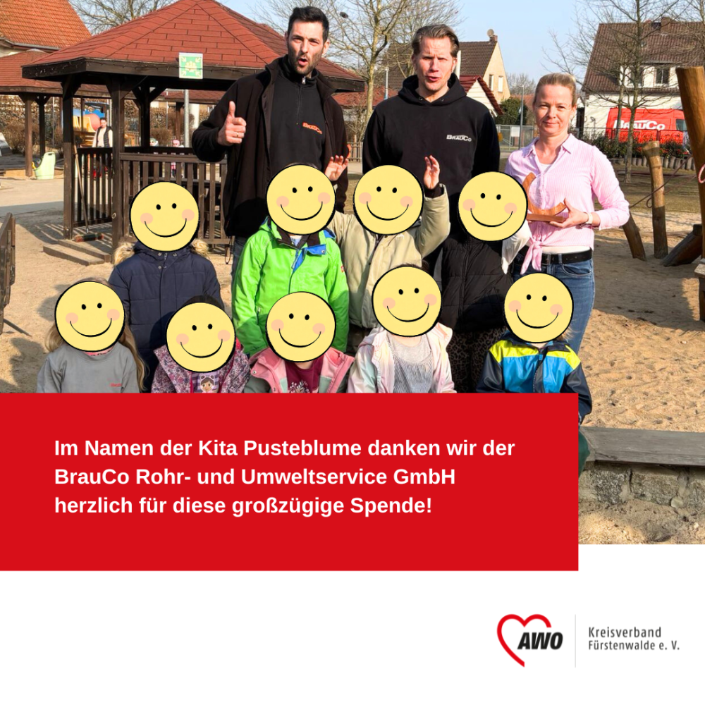 Vor Kurzem besuchte die BrauCo Rohr- und Umweltservice GmbH die Kita Pusteblume in Fürstenwalde und überreichte den Kindern und Fachkräften einen Spendentaler im Wert von 1.500 €.