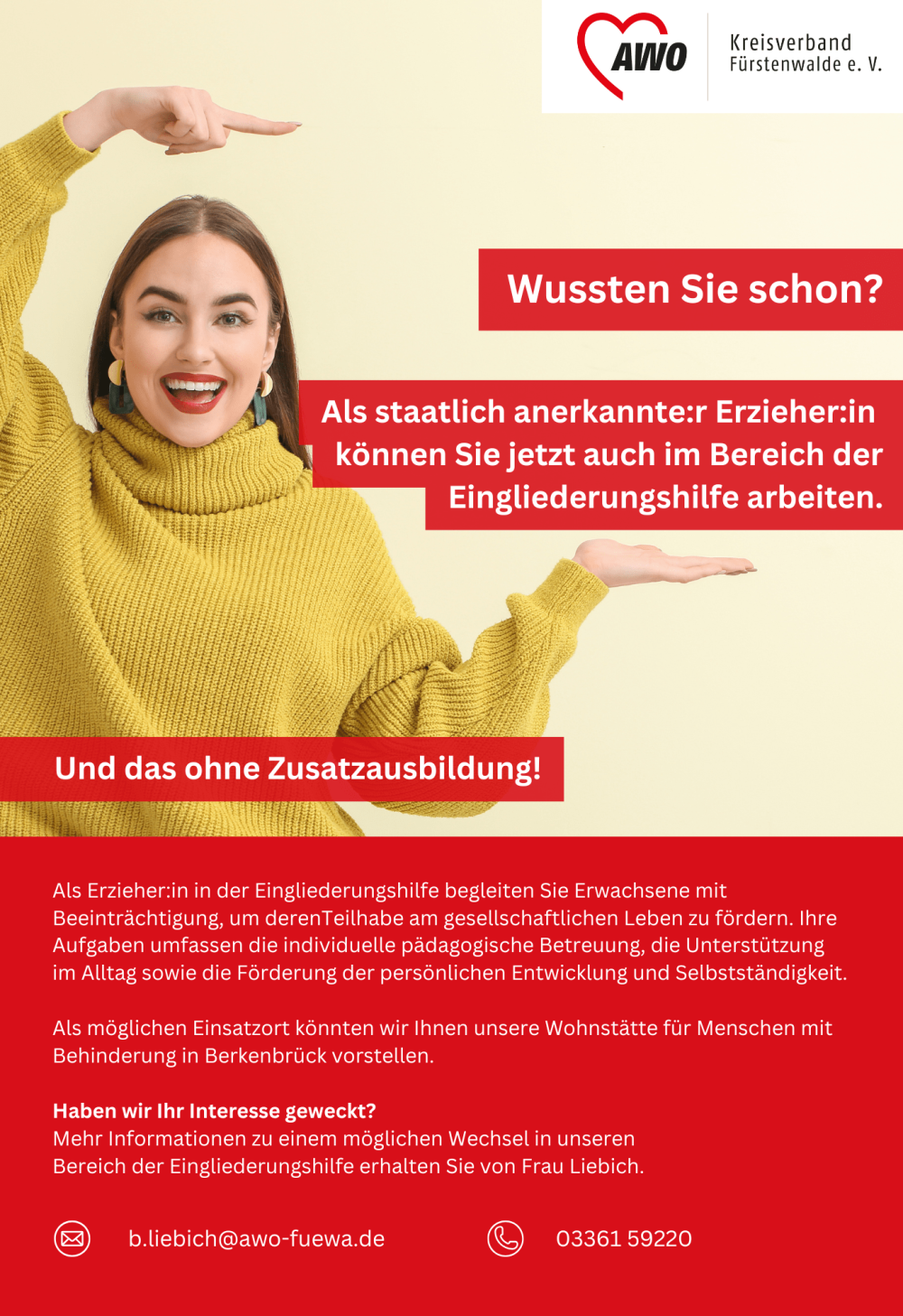 Reichen Sie diese bitte schnellstmöglich in der Geschäftsstelle des AWO Kreisverband Fürstenwalde e. V., Lindenstraße 46, 15517 Fürstenwalde ein.